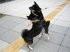 散歩で会うと必ずこんな感じでプロレスになるチョビちゃん。伏せの姿勢(見方によっては戦闘態勢?)でお互いにじっと待ってるももとチョビちゃん、場合によっては10m程の距離でしばらく睨み合いって時も(笑)