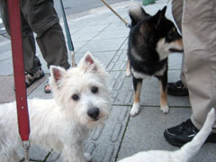 お祭りが終わって、少し静かになった街を散歩中、ウエストハイランドホワイトテリアのヤンちゃん、リーちゃんにばったり、ももの散歩友だちです。なっなっなんと、○ルメスのリードと首輪をしてるんだよぉーん^^;
