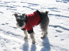 続いて、百々の木ブログ常連のミニチュアシュナウザーのブルーちゃん、久しぶりぃー! 朝日をバックになかなかの美人犬ぶりです。