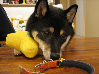 で、今朝散歩前にももに見せたら、こんな感じでとても喜んで離そうとしません。顎の下に挟んでとられまいとがんばちゃってます。よっぽど嬉しかった様で、見ていてなんか切なかったなぁ・・・ぐっさんにはわからないももにとって大事な記憶がこの☆くんと一緒にあるんだねぇーきっと。なら、大事にしないとねぇ、破っちゃったりしないで。