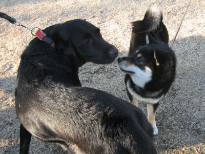 リキくんは、大先輩犬の♂柴わんこ。無作法ももの遊んで遊んで攻撃に「もぉーやかましいなぁ、ウルサイわんっ!」といつも一喝されちゃうのに、でも今日は、なんだか様子が違う?なんかフレンドリーにクンクンし合ってるのですよ。むむっ、これってもしやしてももの体の変化によるものか?!要経過観察です。