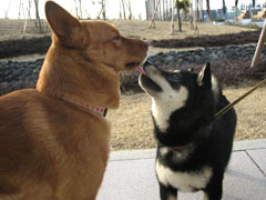 またまたスポーツ公園で、シオンくんと遭遇^^友達犬を見つけると伏せのポーズで待機、相手の距離が近づいたところで猛ダッシュでアプローチってのがももの常套手段なんですけど、これって相手が近ずいて来てくれないことには、ずーっと待ちぼうけな訳で、今日はシオンくんの方からももに「あそぼっかぁー」って感じで寄ってきてくれました、良かったじゃんーもも。