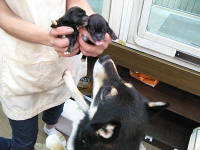 最後が母犬つきちゃん、父犬壱番くんの小犬たち。ちょうどももの入浴中につきちゃんががんばって出産!ついさっきまで羊水に包まれていた様で、真新しい黒い毛がまだしっとりと濡れていましたぁー、ぐっさん感動・・・。