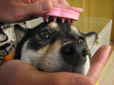 さっそく、捕まえてラバーブラシの刑。毛を抜かれるとなるとビビッと察知して、逃げ回るももですが、頭のてっぺんをブラシでこんな風にされるのは、どうも気持ちいいらしい。と言うわけでこんな感じに恍惚とした顔のもも・・・ですかね?(笑)