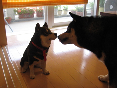 突然のサンちゃんの登場にびっくり!背中の毛を逆立てたままクンクン匂いをかいで大騒ぎで警戒態勢のもも。