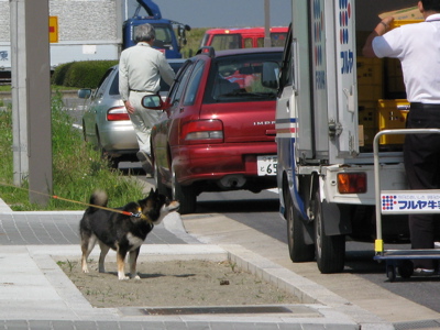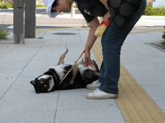 そんな暑気にデバナから調子がくるった様子のもも。散歩にでてすぐの中学校前の歩道でこの通り座り込み、確かに人間も暑いぃー^^;なのでしばらく一緒に歩道脇の縁石に腰掛けて小休止です。と言うわけで、せっかく?だから、ちょいとイタズラ(笑)