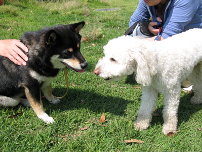 最後に立ち寄った小学校脇の緑地で、真っ白なトイプードルのリッツくんと初対面のご挨拶。なかなかスラッと足長のお兄さんだったので、柄にもなくお嬢さんぶっているもも、おかしっ^^