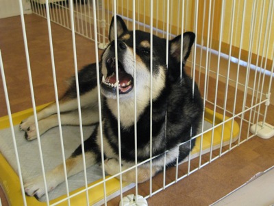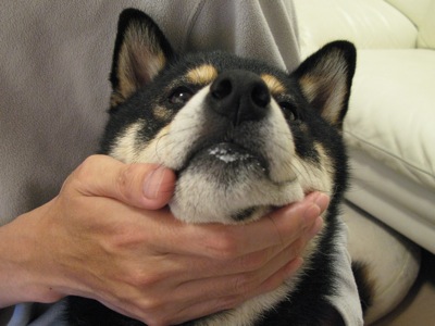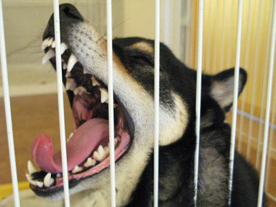 拾った骨を咥えて放さないので、叱られ中。