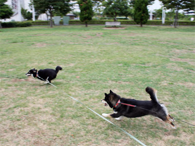 そうなるとげんきんなもので、もも嬢この通り大はしゃぎで走り回っております。というのも、久しぶりに柴とものミサキちゃんと会ったから^^