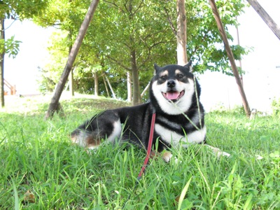 そんな訳で、いつもの朝散歩も終盤、アパートの前の公園まで帰ったところでそろそろと小さな築山を登って行くから、おしっこかな?と思って伸びるリードを少し弛めると、もも、そそっと座ってしまいましたぁ、どうも木陰が涼しかった様子^^