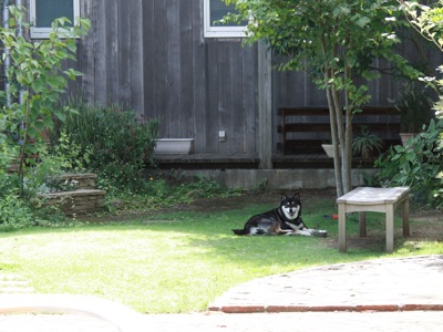 ぐっさんたちのテーブルは、さすがにカンカン照りで辛いから、ももは少し離れたこじんまりとした庭の木陰でひと休み。微笑んでくれている様に見えるけど、実は「自分たちだけでうまいもん食うなよっ!」と睨みを効かせてるとも言える。とまぁ、こんな感じで我が家の夏休みは、なんともシンプルに終わりそうな気配です。