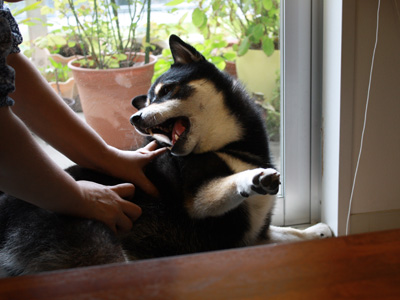 夏の散歩は、休み休み。ちょっと歩いては休憩、これってももだけの事情でもなくて、ついつい「ちょっと休んでく?」と声をかけるのは飼い主の方だったりする(笑) こんな風に、ふざけて過ごすのも楽しいしね。
