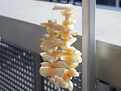 せん切りにしたゆず皮を芯にして干し大根で一巻き、それを木綿糸に通す。ネックレスのようになったゆず巻き大根を、もう一日ひなたに干した後、甘酢に漬け込めば出来上がりというとてもシンプルなレシピ。筑波おろしが吹きはじめるとゆず巻き大根をつくる合図なのだそうで、やっとこさ冬らしく寒くなってきたこの頃だし、風はとても冷たくて乾いていて、もしかすると今はいいタイミングなのかもです。さてさて、どんな味がするんだろうか、楽しみ。