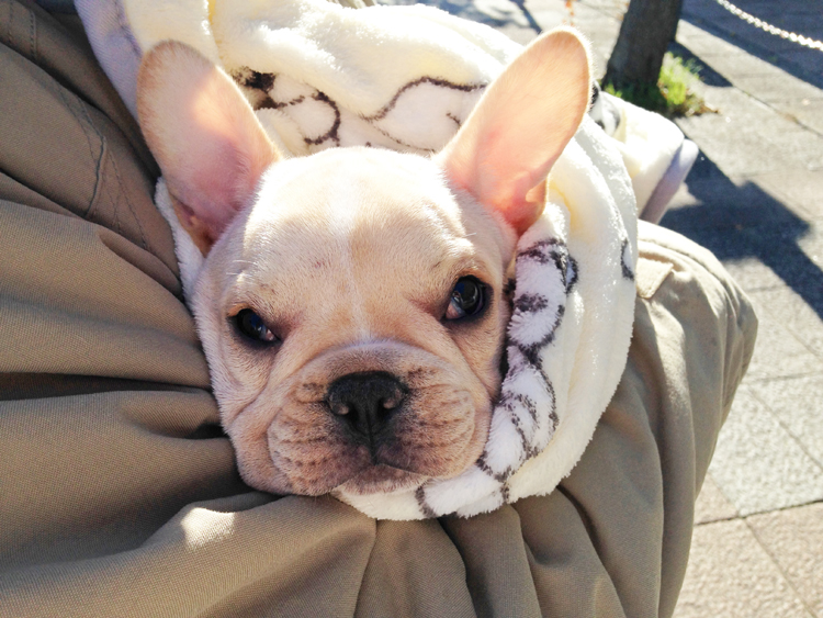 朝散歩で、ちっこいガッちゃんに会いましたぁー!まだ2ヶ月で散歩デビュー前だから、毛布にくるまってパパさんの腕の中、ポカポカで眠そうな顔でした。