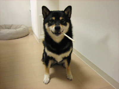 先週末にブリーダーさんちに里帰り&シャンプーのときに、奥さんから頂いたシガーチョコっぽい(歳がばれるか^^;)見た目のミルク味のガム。大事に今日までとっておいたのですがそろそろ持ち出してきたもも^^