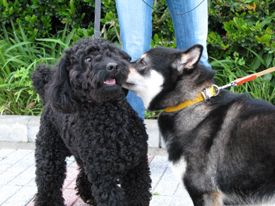 散歩で出会したトイプードルの立派な男の子。初めてなのに急接近でしきりにクンクンするもも。ごめんねぇー、馴れ馴れしい小娘で^^;