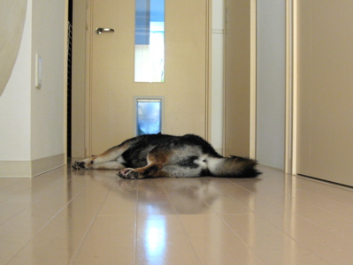 散歩から帰ってすっかり外の暑気にやられ、ヒンヤリ廊下でこんな感じで涼を取っているウダウダなももでございます^^