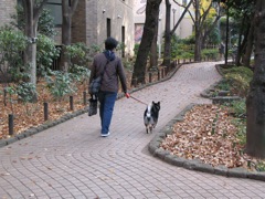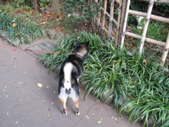 2時間ほどでシャンプーを終え、すっかりキレイさっぱりのもも、前回のこともあるので、すこし様子を見てから帰ったらどうかとのブリーダーさんのお勧めもあって、すぐ近くの親水公園をしばし散歩。おなかの様子を気にかけているぐっさんたちをよそに、ももはすっかり興味津々であちこち匂いを嗅いでみたり、覗いてみたり。垣根の奥へ身を乗り出して何やら覗き込むもも。どしたの?