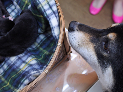 カゴの中には、しっとりとした赤ちゃん特有のツヤのある黒毛の弟妹たち4匹が、押し合いへし合い(^_-)