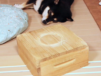 あたらしいご飯椀がしっくりくるように、子犬のころから使っているご飯台に溝をつけました。