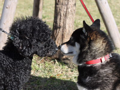 昨日の雨がうそのように晴れて、なんとも清々しい秋日和の朝。ももハハに連れられての散歩途中に(ぐっさんは、朝寝坊中^^;)仲良しトイプーのクロちゃんと遭遇、こんな感じの朝のご挨拶。