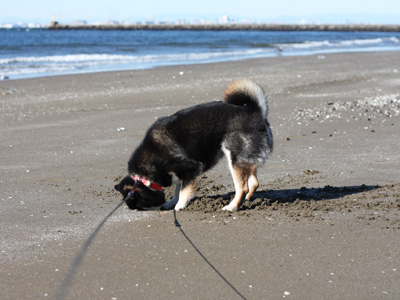 最後は、いつもの砂浜で恒例の穴掘り。掘っても、覗いてもなーんも出てこないんだけど、掘らずにはいられないのよねぇー。