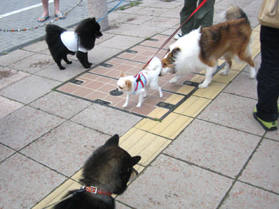 お祭りが終わって、少し静かになった街を散歩中、ウエストハイランドホワイトテリアのヤンちゃん、リーちゃんにばったり、ももの散歩友だちです。なっなっなんと、○ルメスのリードと首輪をしてるんだよぉーん^^;