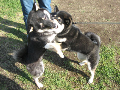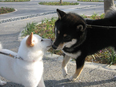 と言った講釈は、ほとんど関知しないもも嬢は、遭遇したとってもカワイイ白柴ちゃん(6ヶ月)と仲むつまじい様子でご挨拶しておりました。あまりにおとなしい白柴ちゃんにももにしては奇跡的にソフトなアプローチ、ぐっさんはちょっとびっくりでしたよ^^