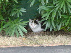 いやいや、ぐっさんの気持ちの中だけのできごとですが(笑) すると、見透かされるようにキョウチクトウの根元からひょっこり覗いていた三毛の野良猫と目が合っちゃいました、恥ずかしっ^^;