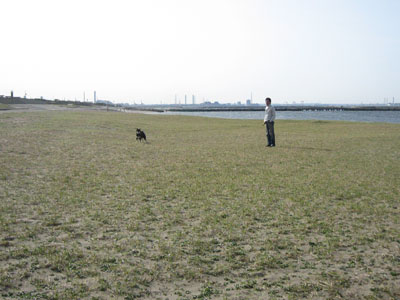 そのまま少し遠回りして橋を渡って花見川の対岸へ。サイクリングコース脇の芝生の路肩を通ってそのまま海岸までジョギングやサイクリングをする人たちに混じって歩きました。近ごろのもも嬢、とみに落ち着いて歩けるようになってきたので少し年季の入ったシバヌシ風を気取ってみたり。